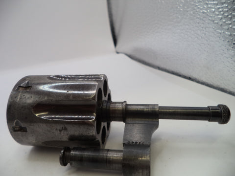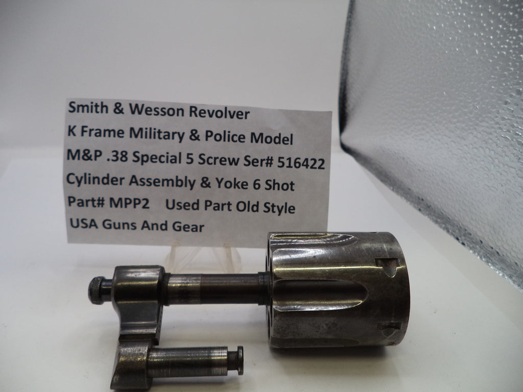 6-shot cylinder assembly and yoke for Smith & Wesson K Frame Military & Police (Pre Model 10) .38 Special revolver, with a 5-screw configuration and serial number 516422. This vintage used component is ideal for accurate restoration and upkeep.