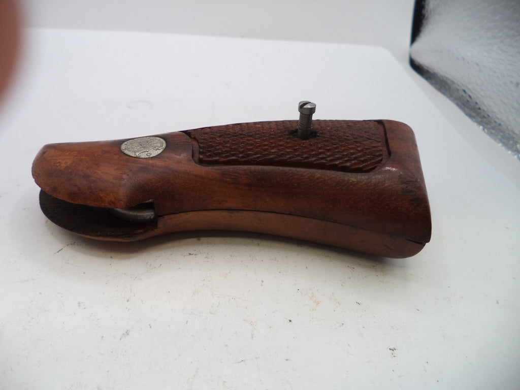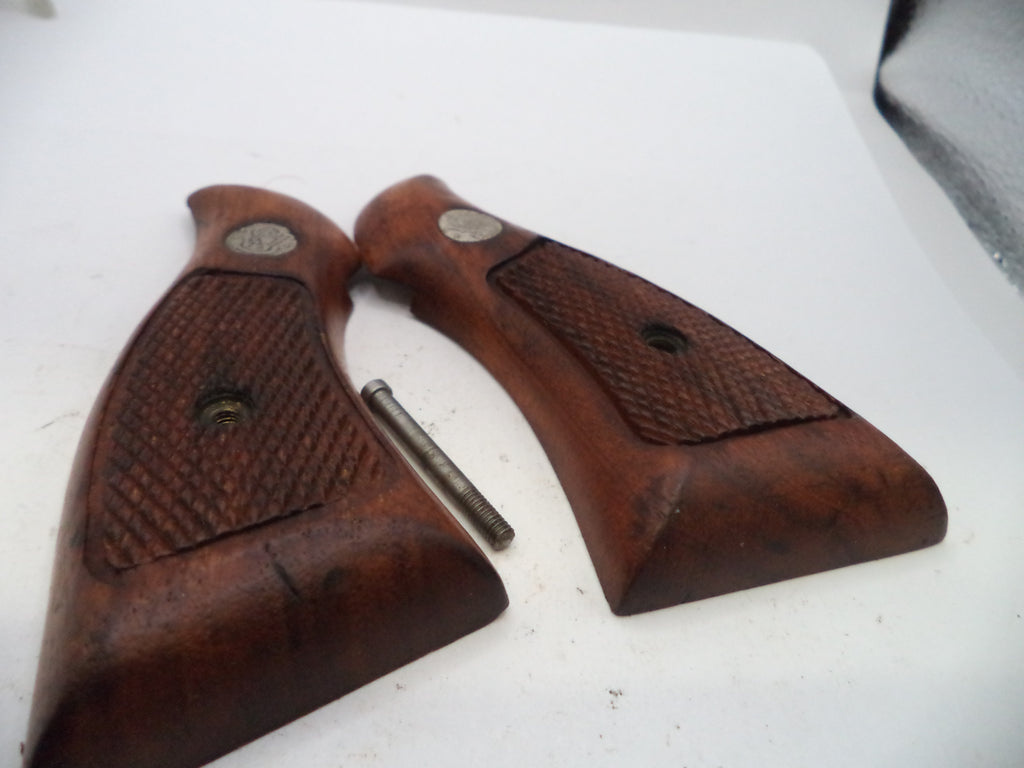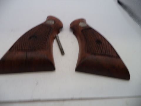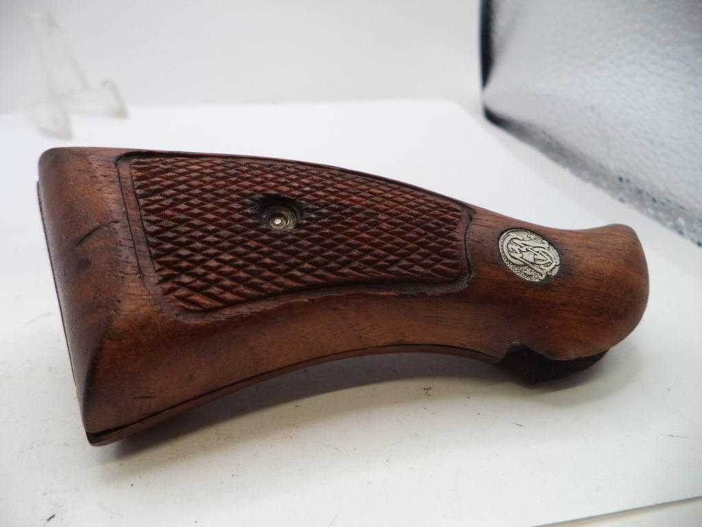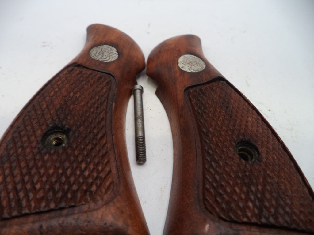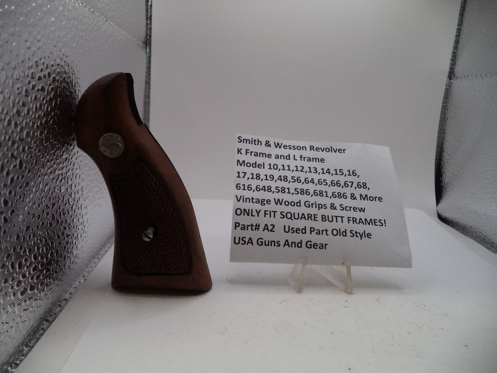 These vintage wood grips with screw are designed exclusively for Smith & Wesson K and L Frame revolvers with square butt frames. They fit a wide range of models, including 10, 11, 12, 13, 14, 15, 16, 17, 18, 19, 48, 56, 64, 65, 66, 67, 68, 616, 648, 581, 586, 681, 686, and more. This is an authentic, old-style used part intended specifically for square butt configurations.