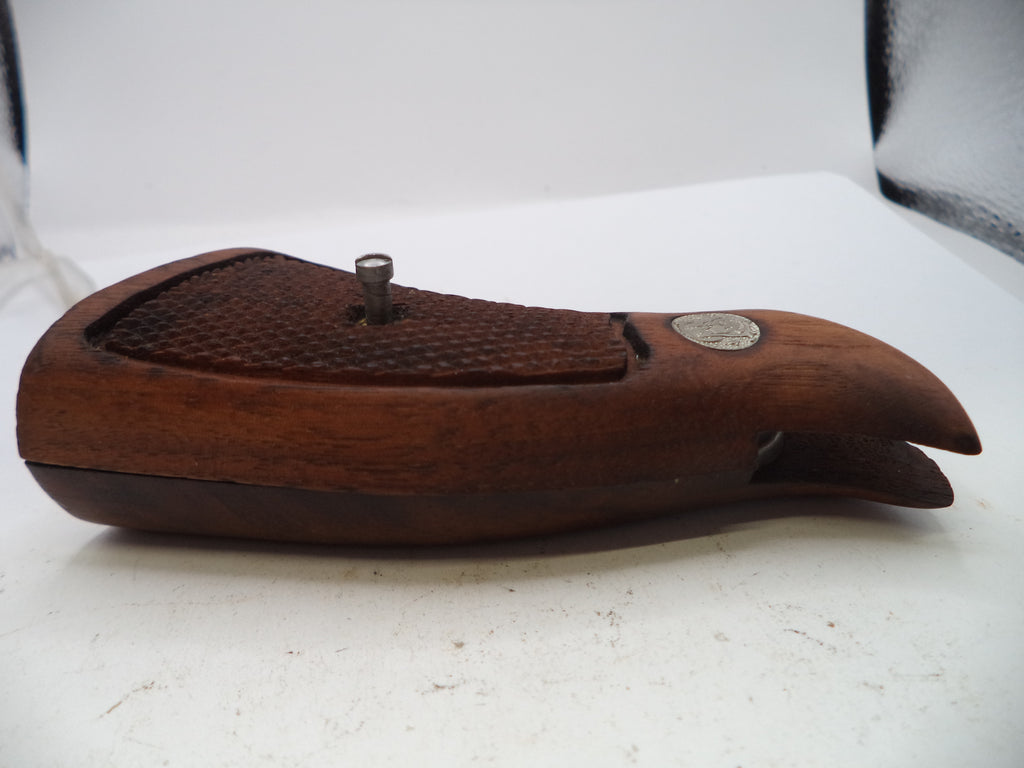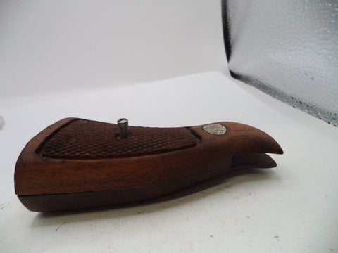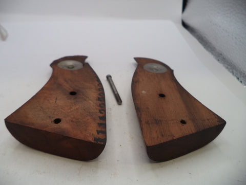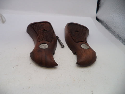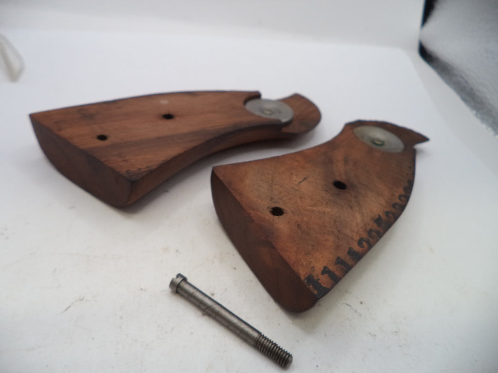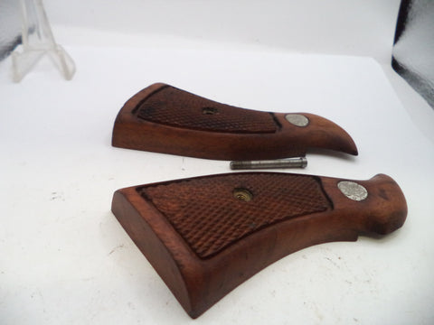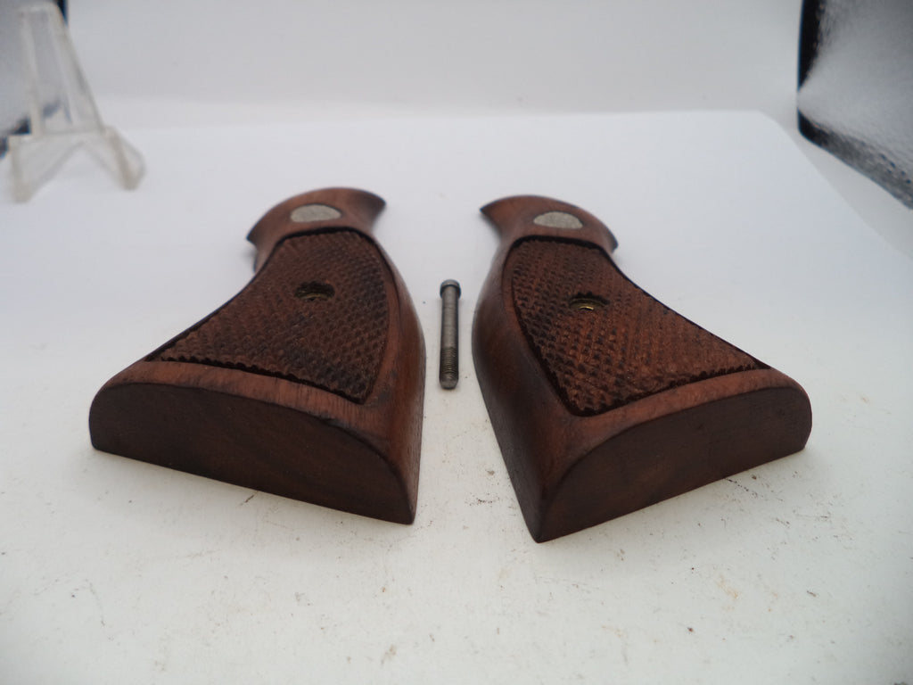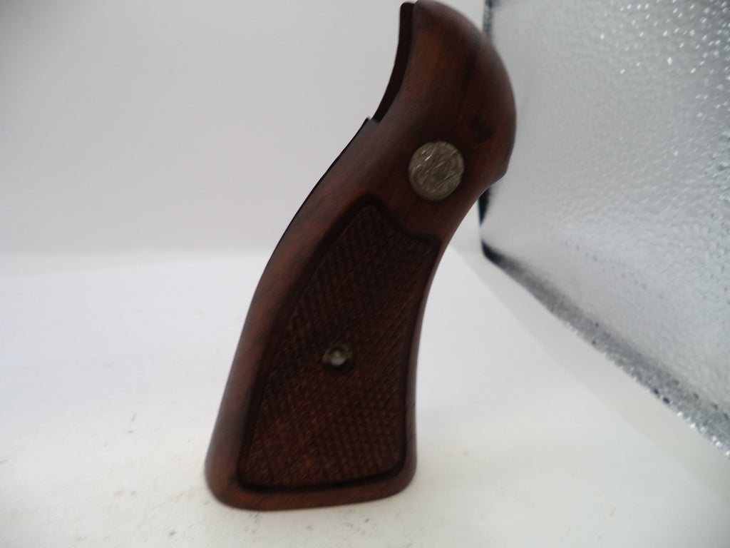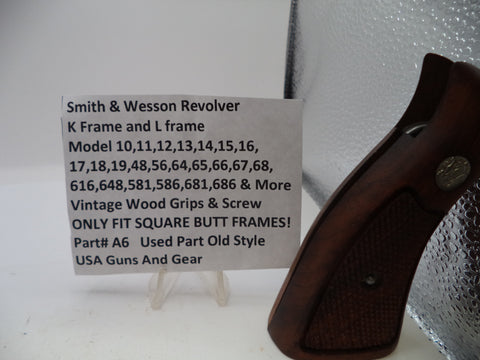 These vintage wood grips with screw are designed exclusively for Smith & Wesson K and L Frame revolvers with square butt frames. They fit a wide range of models, including 10, 11, 12, 13, 14, 15, 16, 17, 18, 19, 48, 56, 64, 65, 66, 67, 68, 616, 648, 581, 586, 681, 686, and more. This is an authentic, old-style used part intended specifically for square butt configurations.