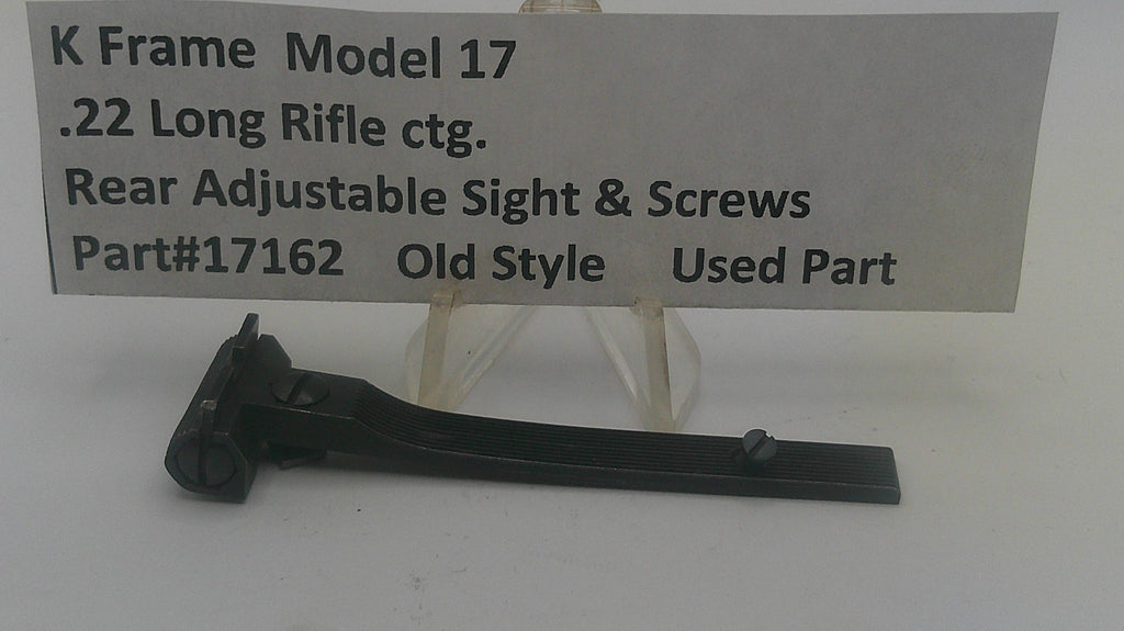 Authentic Smith & Wesson factory rear adjustable sight assembly with screws for K Frame Model 17 revolvers chambered in .22 Long Rifle. This old-style used sight allows for precise windage and elevation adjustments for accurate target shooting.