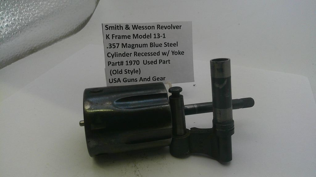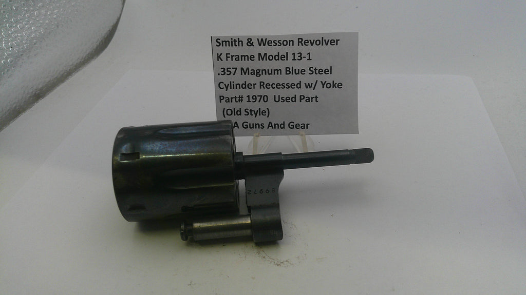 Smith & Wesson K Frame Model 13-1 .357 Magnum cylinder and yoke, featuring recessed blue steel, a 6-shot capacity, and a 4" barrel ring. This vintage used component is designed for classic revolvers and showcases the traditional style.
