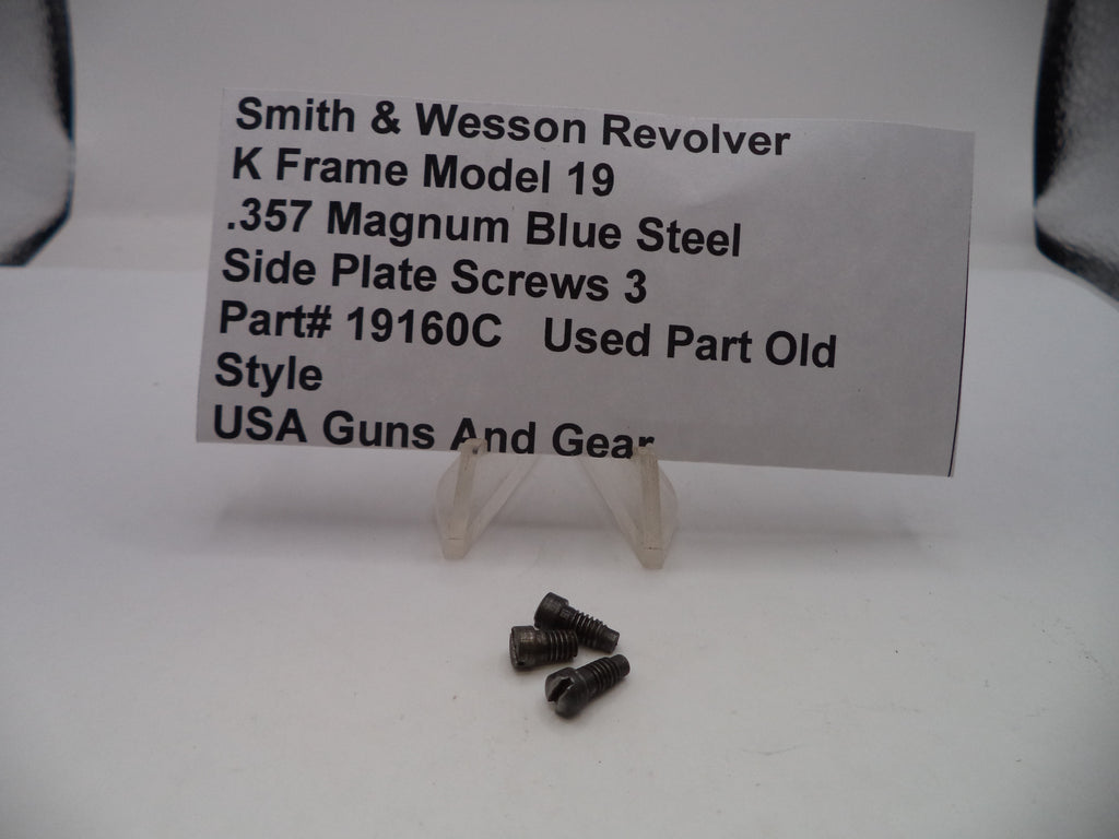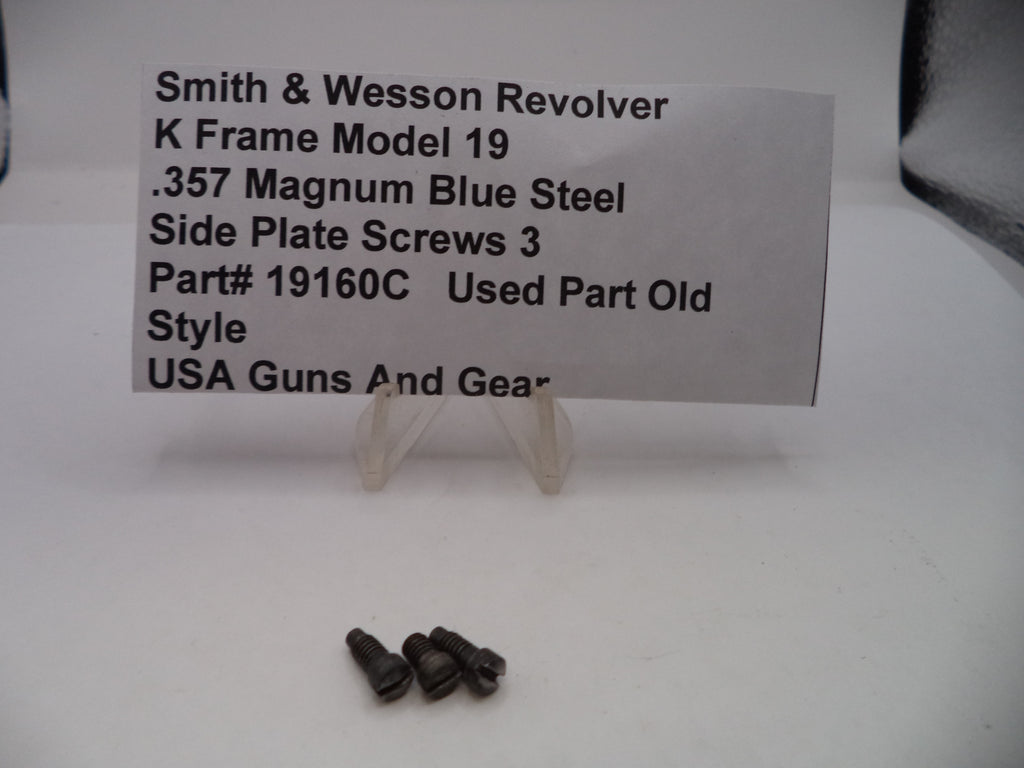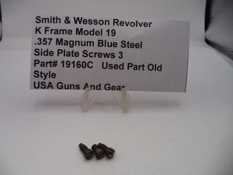 These three blue steel side plate screws are genuine used parts designed for the Smith & Wesson K Frame Model 19 .357 Magnum revolver, reflecting the original old-style specifications. Part# 19160C