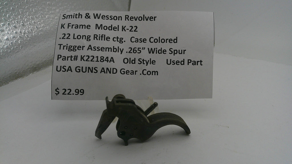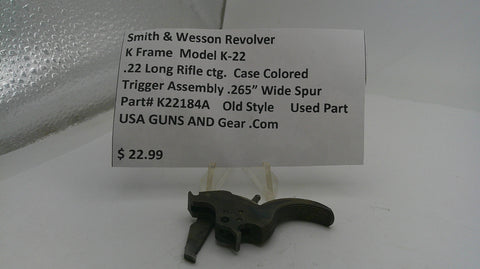 The Smith & Wesson K Frame Model K22 trigger assembly is designed for .22 Long Rifle rounds and includes a .265" wide spur. This vintage-style, case-colored used part is specifically crafted for K frame revolvers, ensuring authentic restoration or maintenance.
