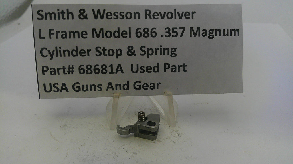This is a used cylinder stop and spring, manufactured using MIM technology, compatible with Smith & Wesson Revolver L Size Model 686-6 and later versions chambered in .357 Magnum.