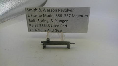 This genuine Smith & Wesson component set is engineered for the L Frame Model 586 revolver chambered in .357 Magnum. The assembly includes the bolt mechanism, corresponding spring, and plunger—critical parts that work together to control cylinder rotation and locking. As a used part, it carries the reliability characteristic of S&W's renowned revolver platform. Ideal for gunsmiths, armorers, or shooters performing maintenance or restoration work on this classic wheelgun.