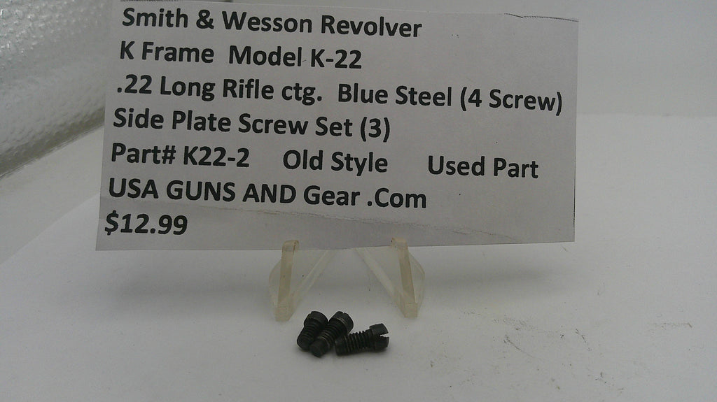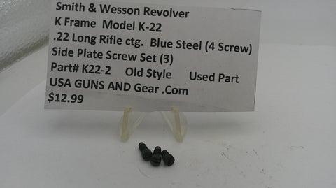 This is a used set of four blue steel side plate screws (three included) designed for the Smith & Wesson K Frame Model K-22 .22 Long Rifle revolver, featuring the old-style configuration. Part# K22-2