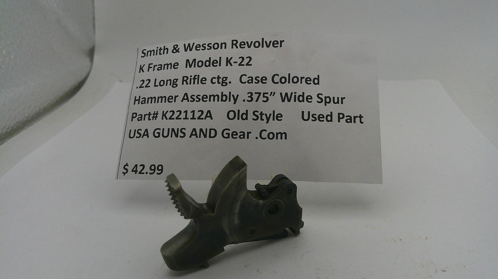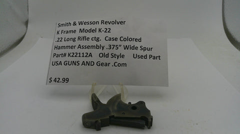 This is a vintage used hammer assembly for the Smith & Wesson K Frame Model K22 revolver, measuring .375" wide. It features a case-colored, checkered spur design and is chambered for the .22 Long Rifle cartridge, reflecting the old-style craftsmanship.