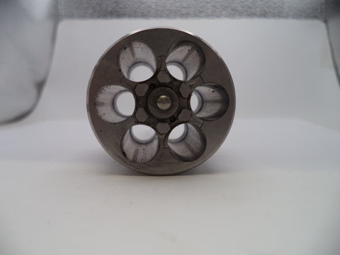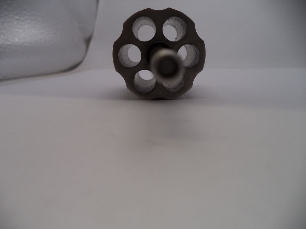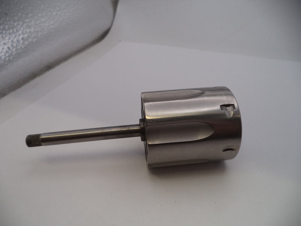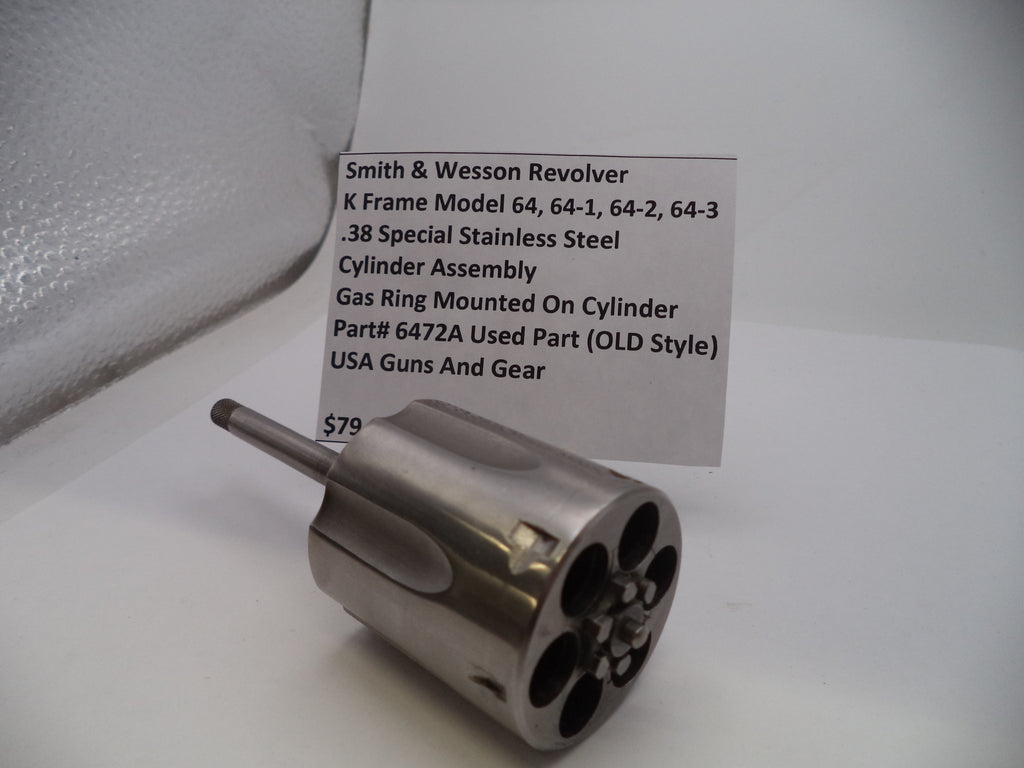 Smith & Wesson K Frame Model 64 series (.38 Special) cylinder and yoke, suitable for models 64, 64-1, 64-2, and 64-3. This stainless steel cylinder features a 1.56" length, 1.44" diameter, and includes a gas ring. Designed for 6-shot capacity with barrel lengths of 4" or longer. This is a vintage, pre-owned component.