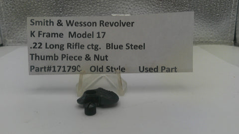Authentic Smith & Wesson factory thumb piece and nut assembly for K Frame Model 17 revolvers chambered in .22 Long Rifle. This used blue steel component is essential for cylinder release operation.