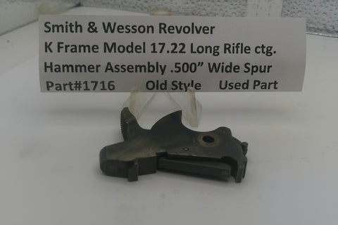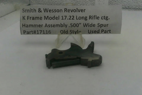 This is a genuine Smith & Wesson factory hammer assembly for the K Frame Model 17 revolver chambered in .22 Long Rifle. The hammer features a .500" wide spur design with classic case colored finish. This old style part is in good working condition and represents excellent value for revolver restoration or repair projects.